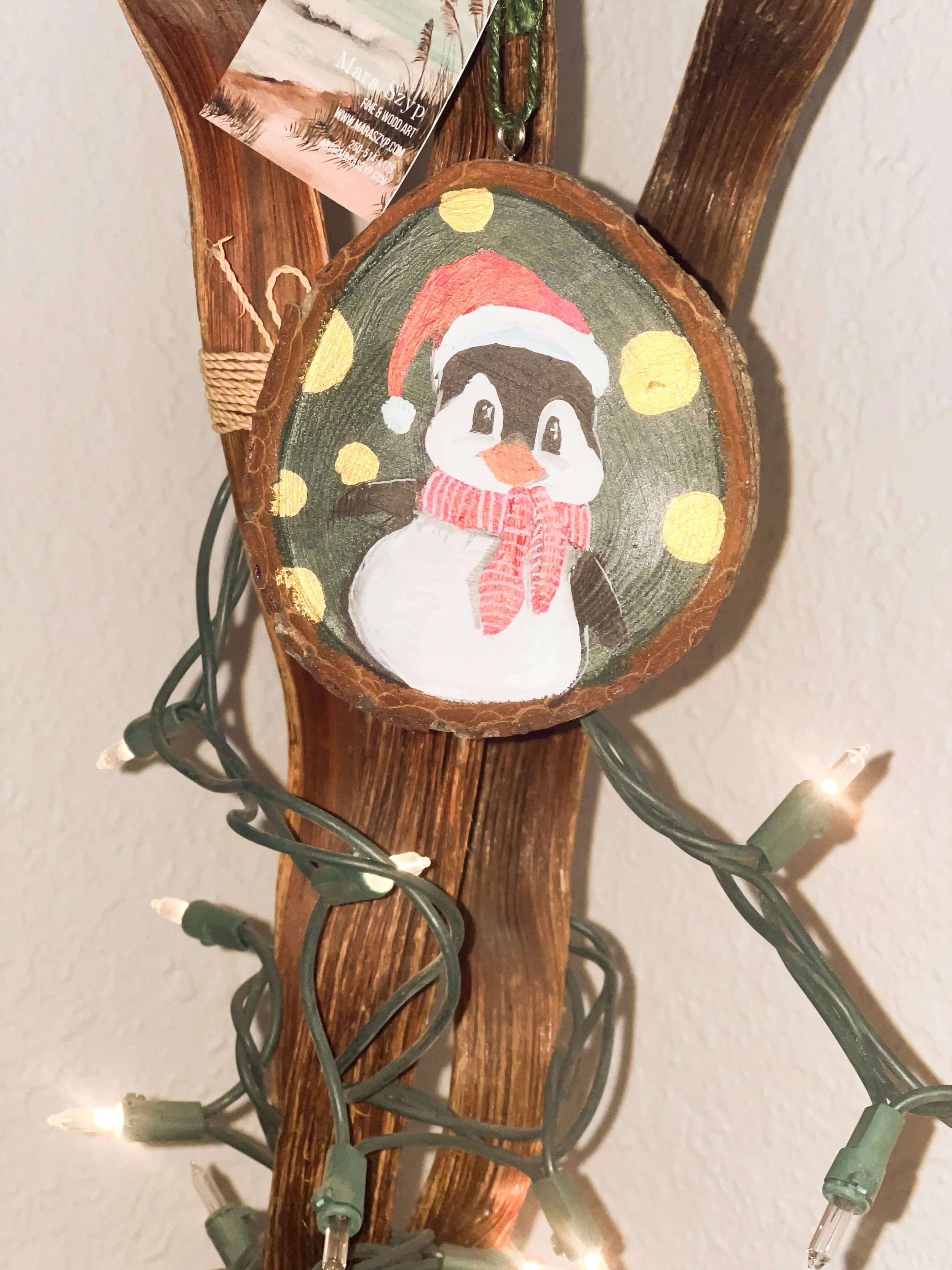 This is a one-of-a-kind piece. I use a slab of wood locally sourced from Vancouver Island, which is treated and cut right here on the island. Each piece is hand-made and hand-painted, then covered with clear resin to create a beautiful hanging ornament.