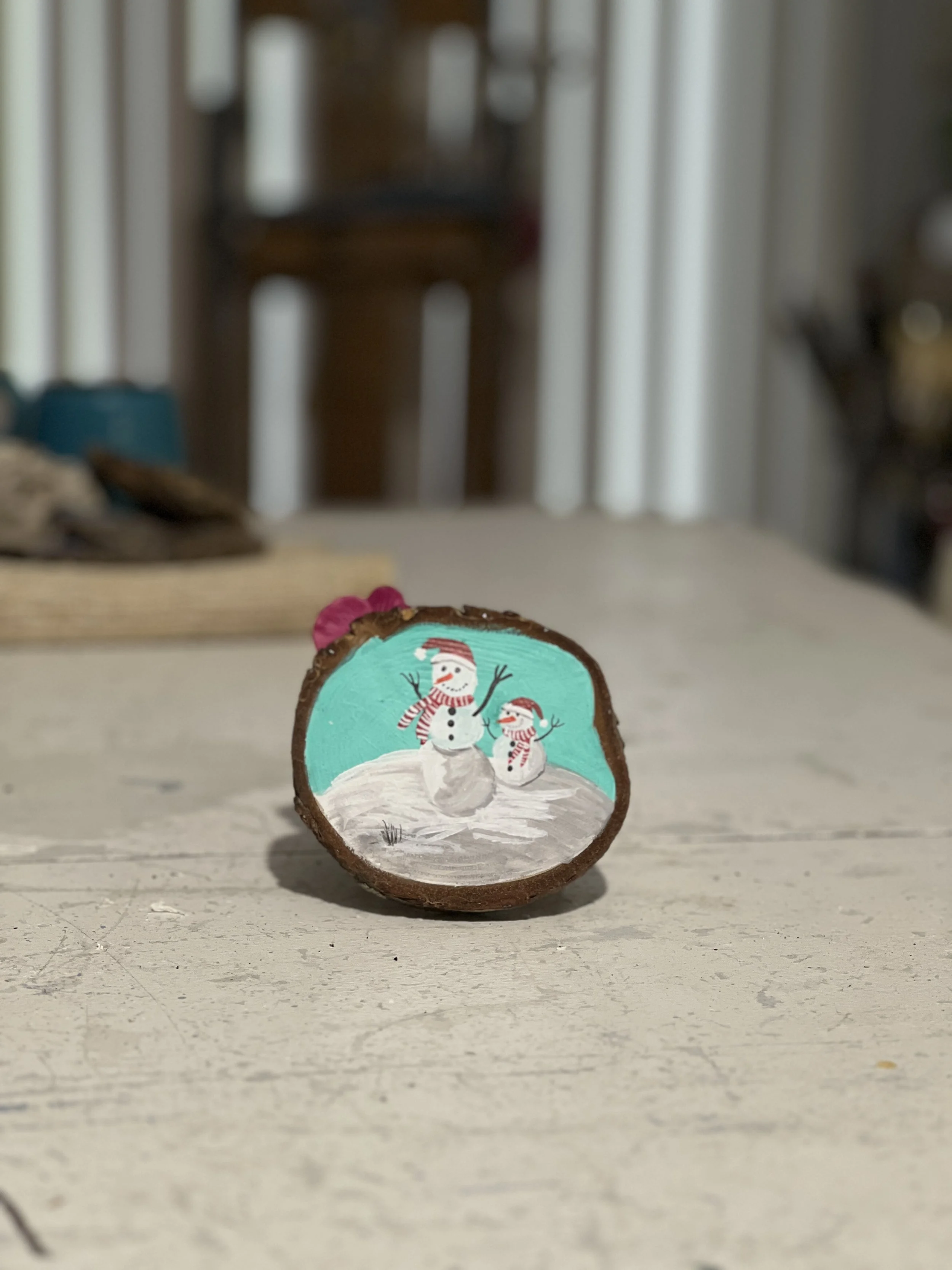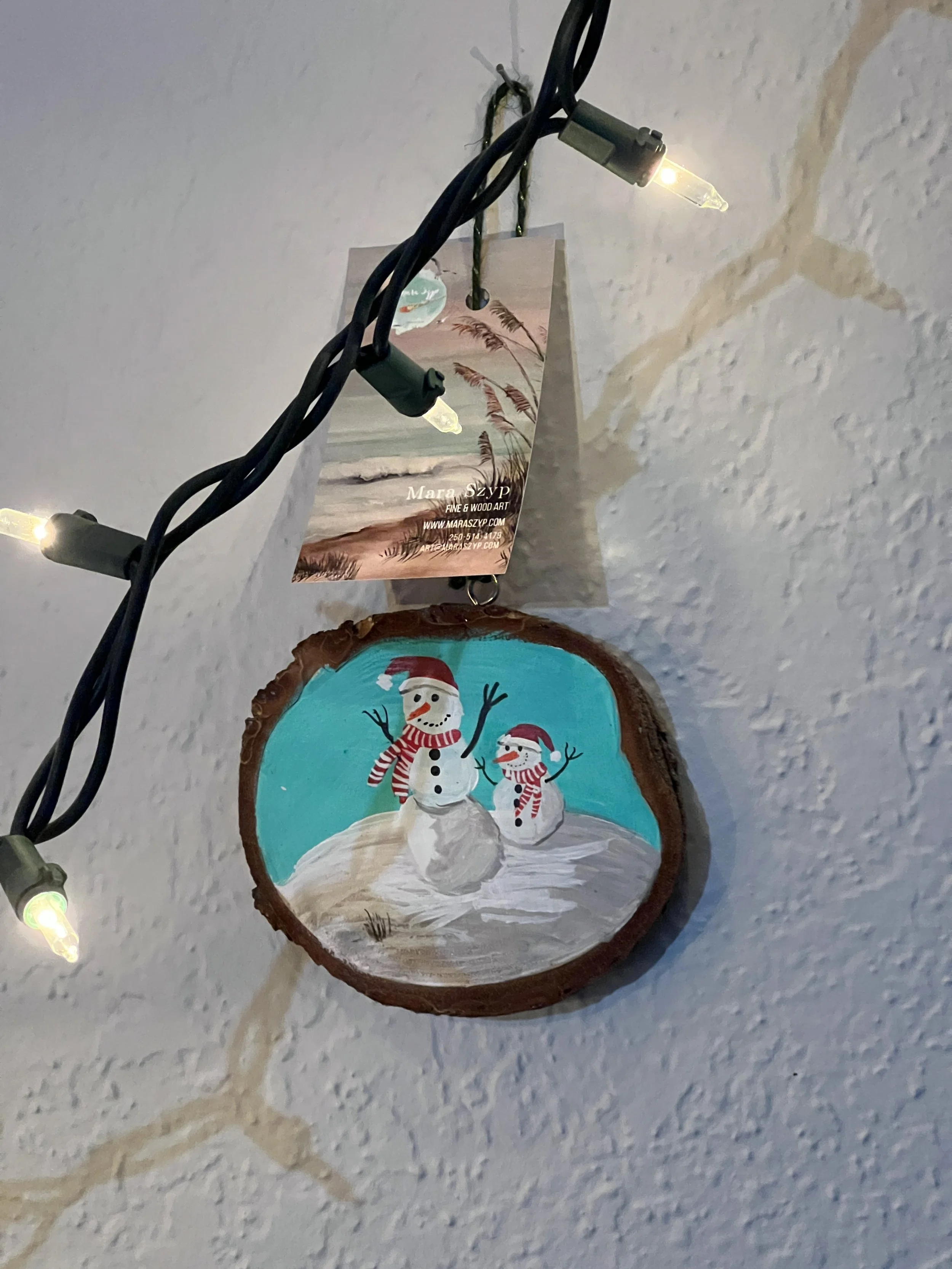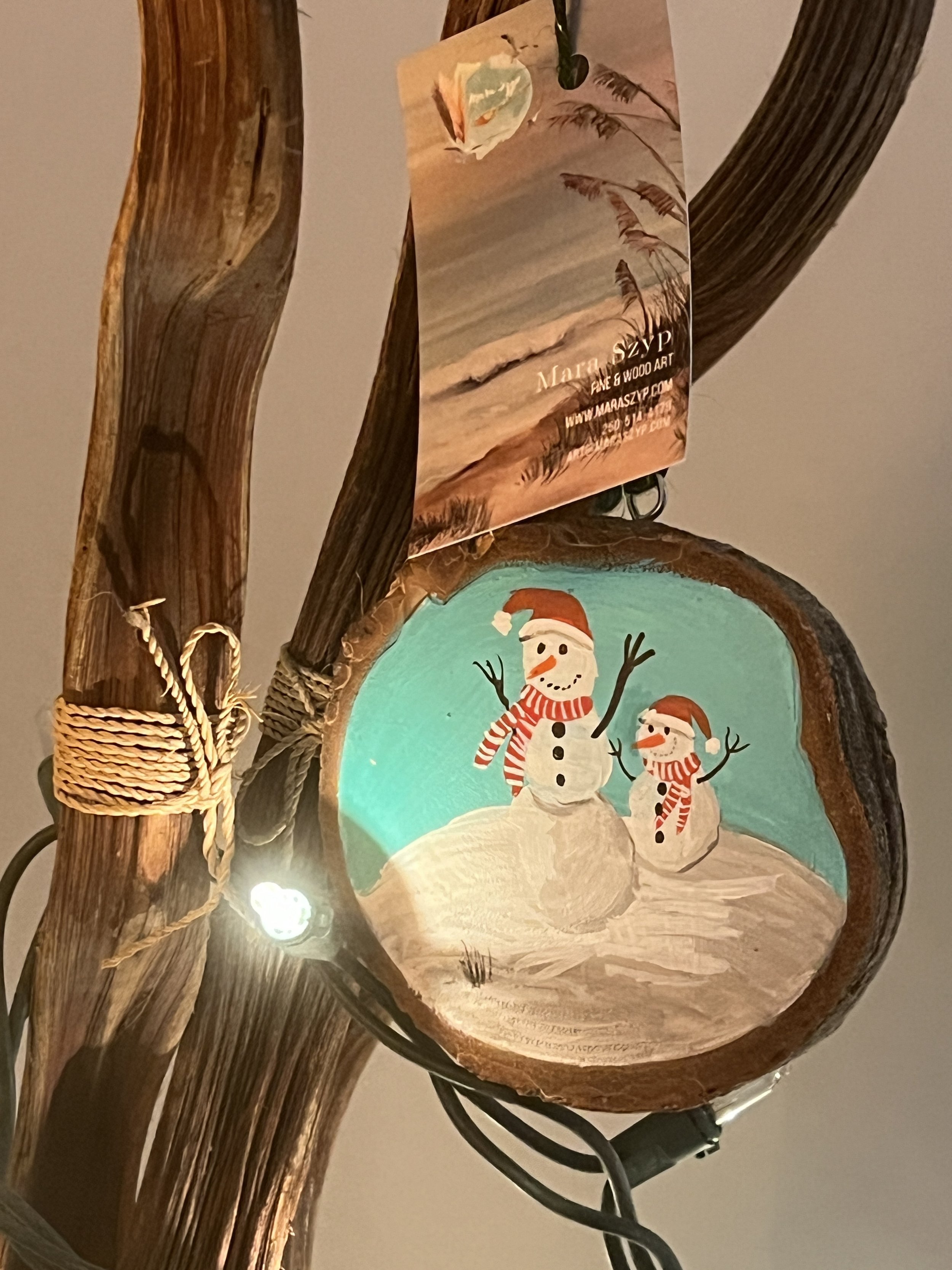 This is a one-of-a-kind piece. I use a slab of wood locally sourced from Vancouver Island, which is treated and cut right here on the island. Each piece is hand-made and hand-painted, then covered with clear resin to create a beautiful hanging ornament.
