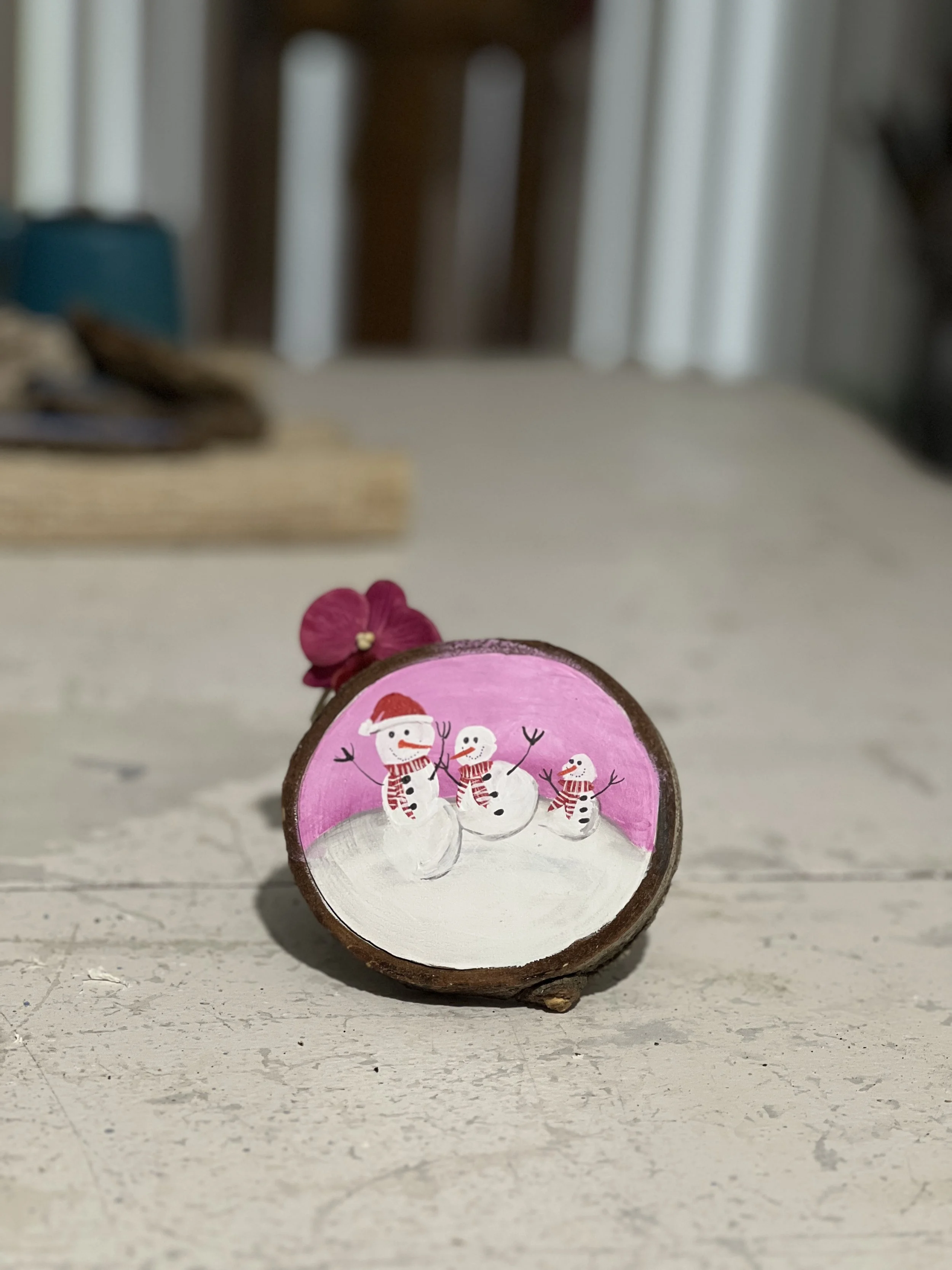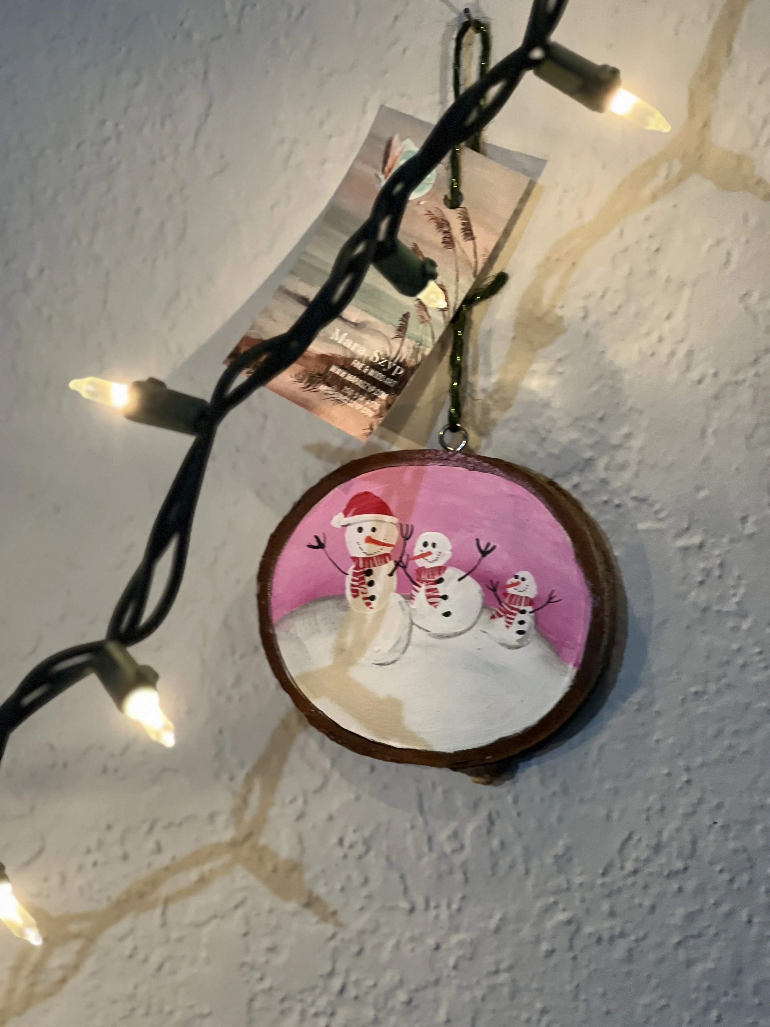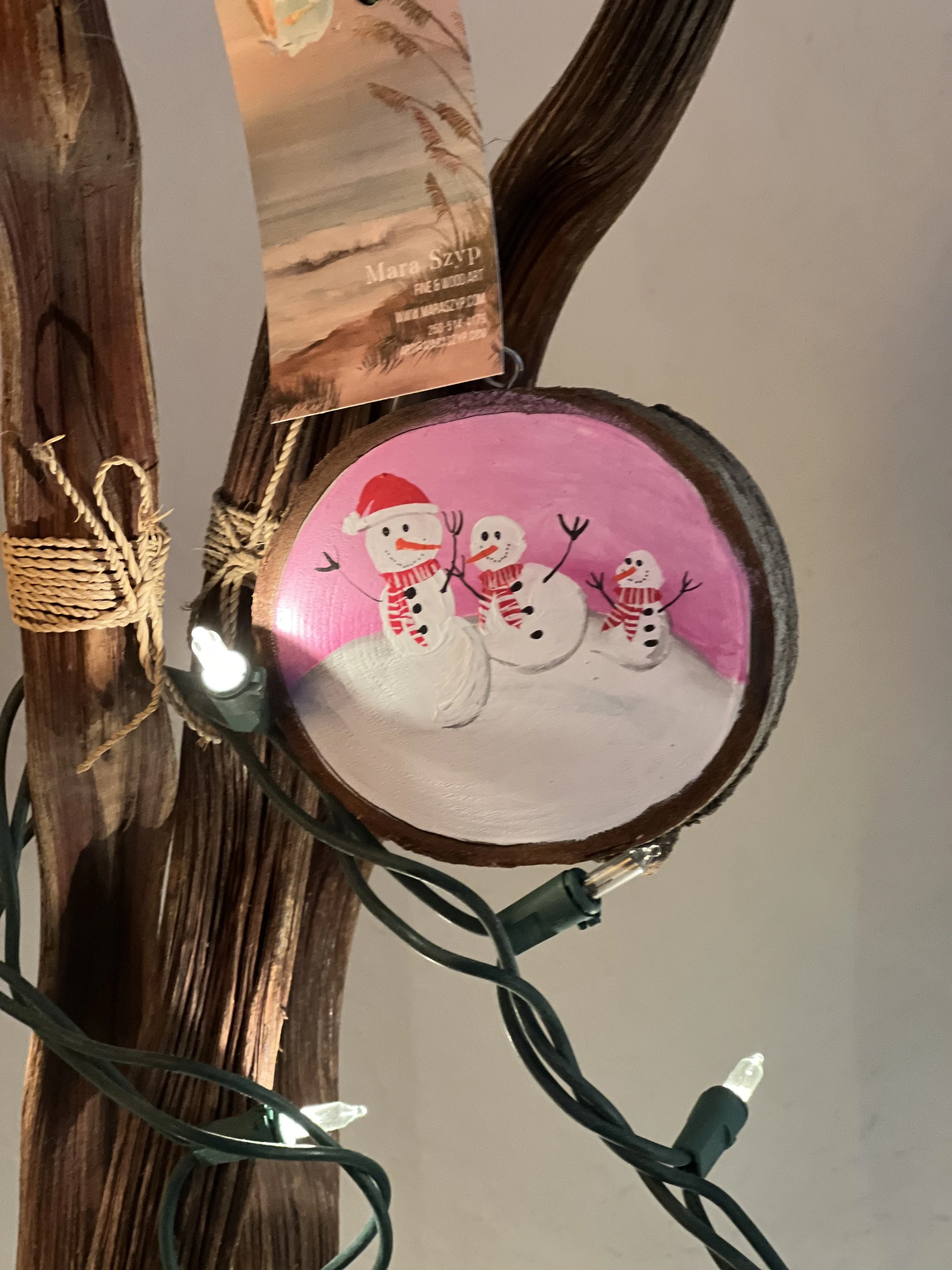 This is a one-of-a-kind piece. I use a slab of wood locally sourced from Vancouver Island, which is treated and cut right here on the island. Each piece is hand-made and hand-painted, then covered with clear resin to create a beautiful hanging ornament.