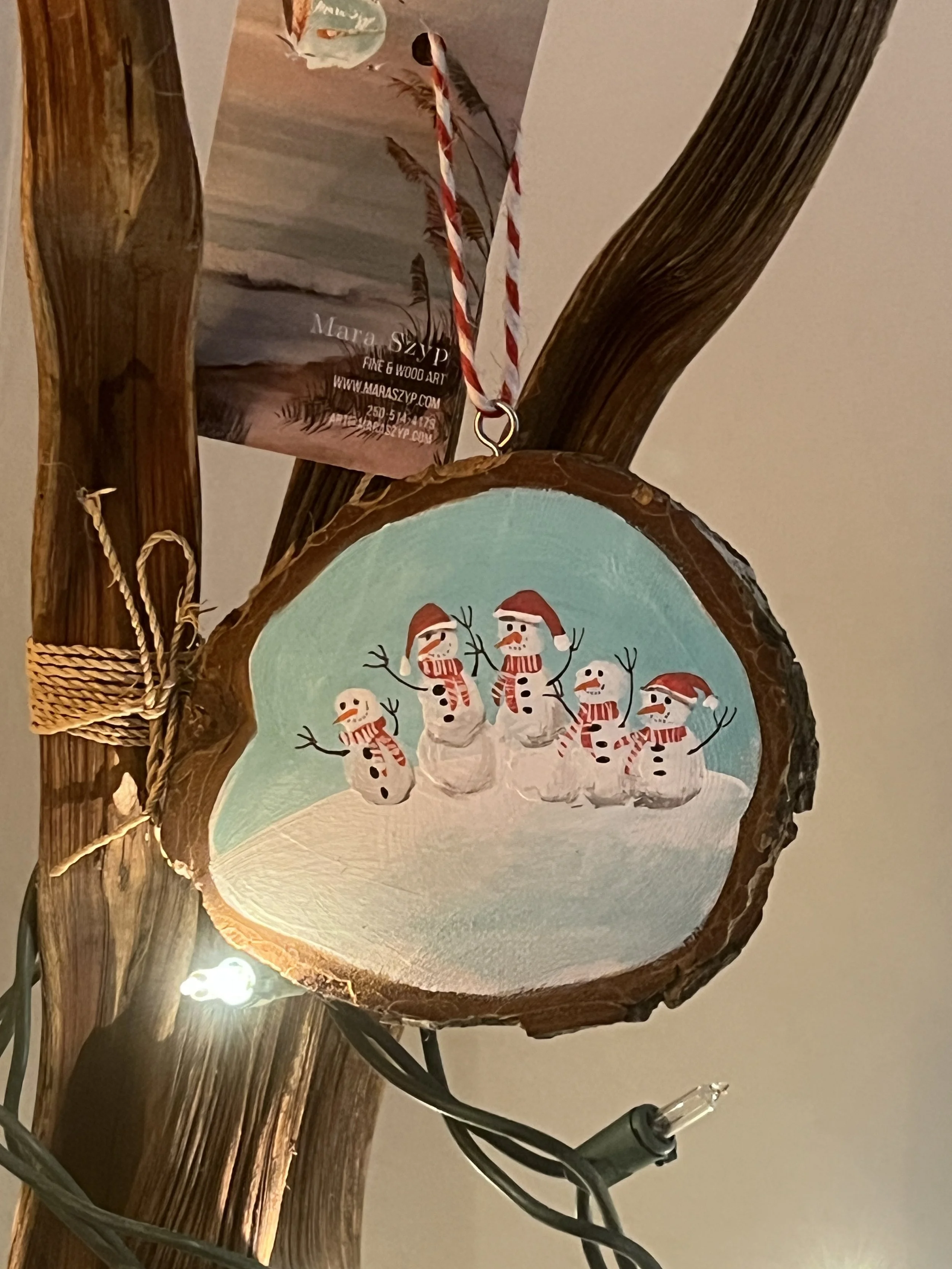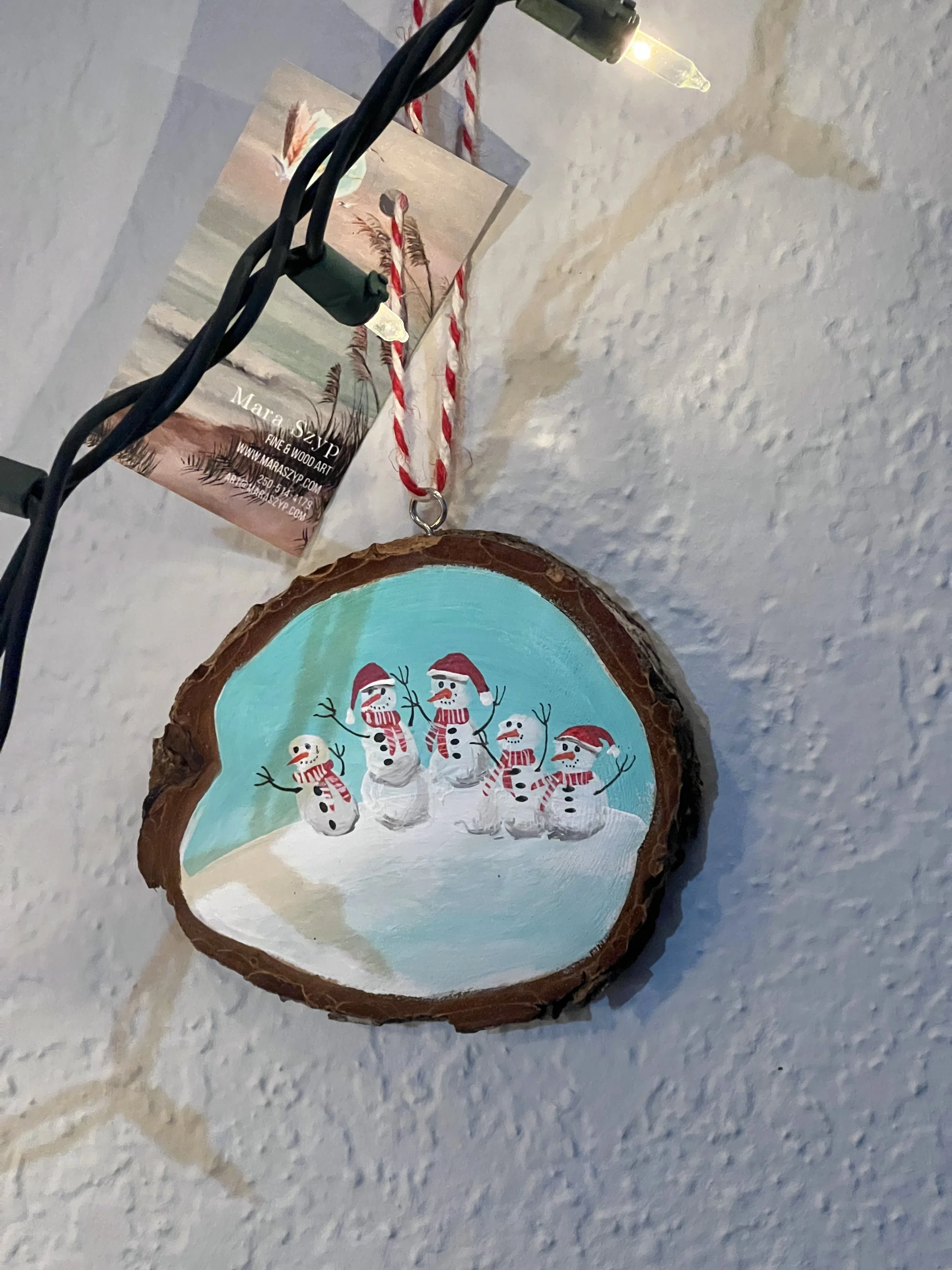 This is a one-of-a-kind piece. I use a slab of wood locally sourced from Vancouver Island, which is treated and cut right here on the island. Each piece is hand-made and hand-painted, then covered with clear resin to create a beautiful hanging ornament.