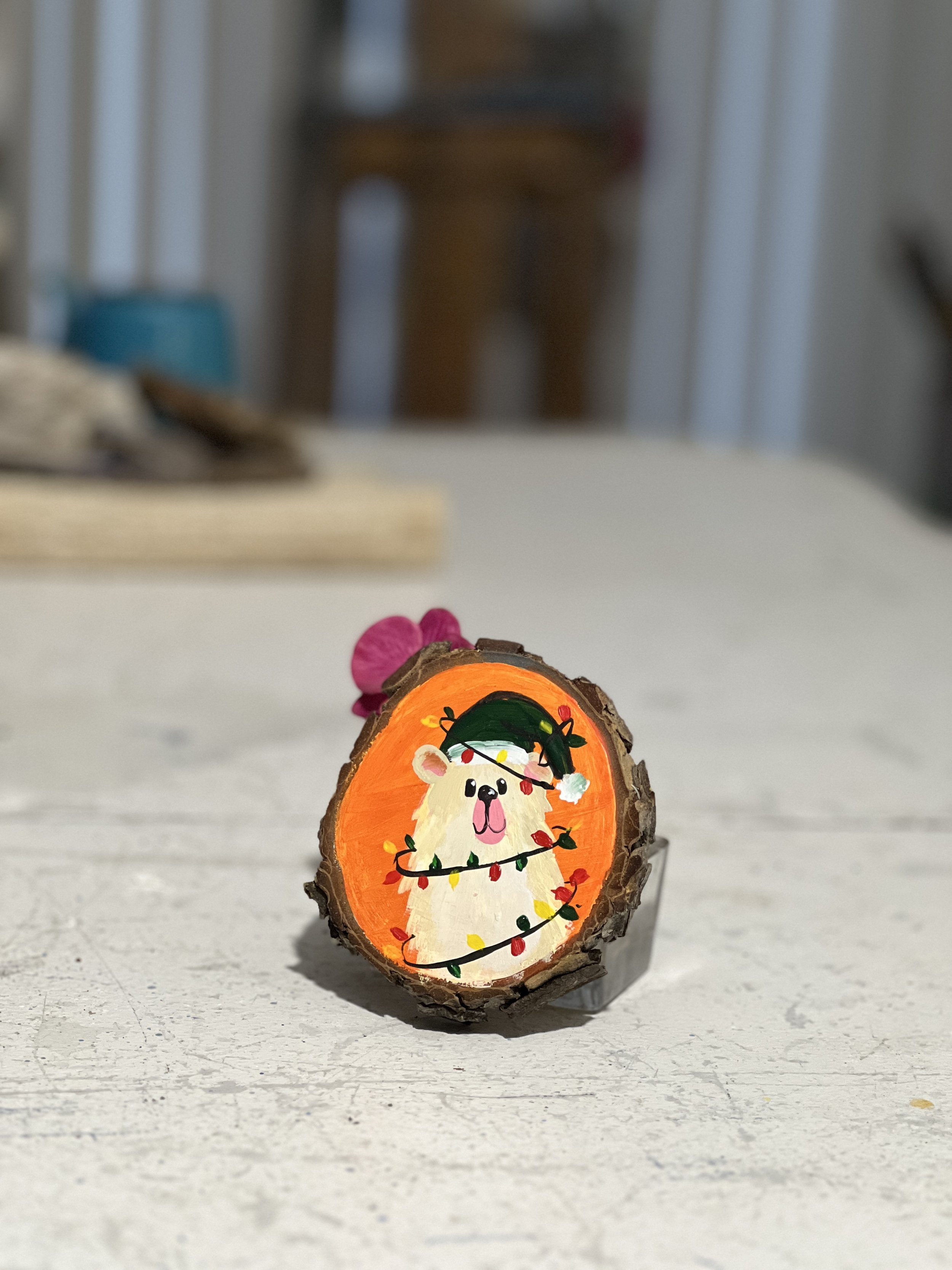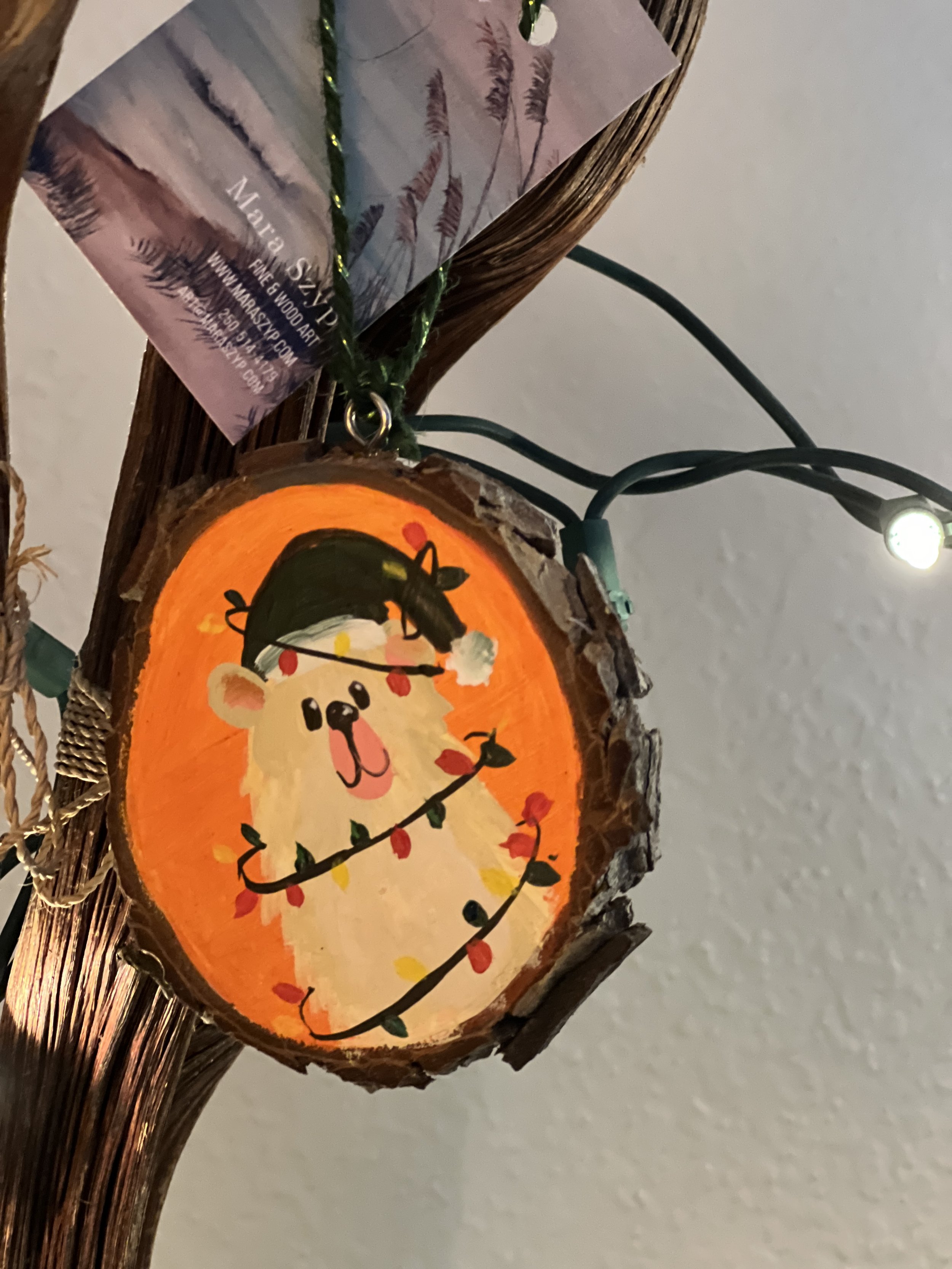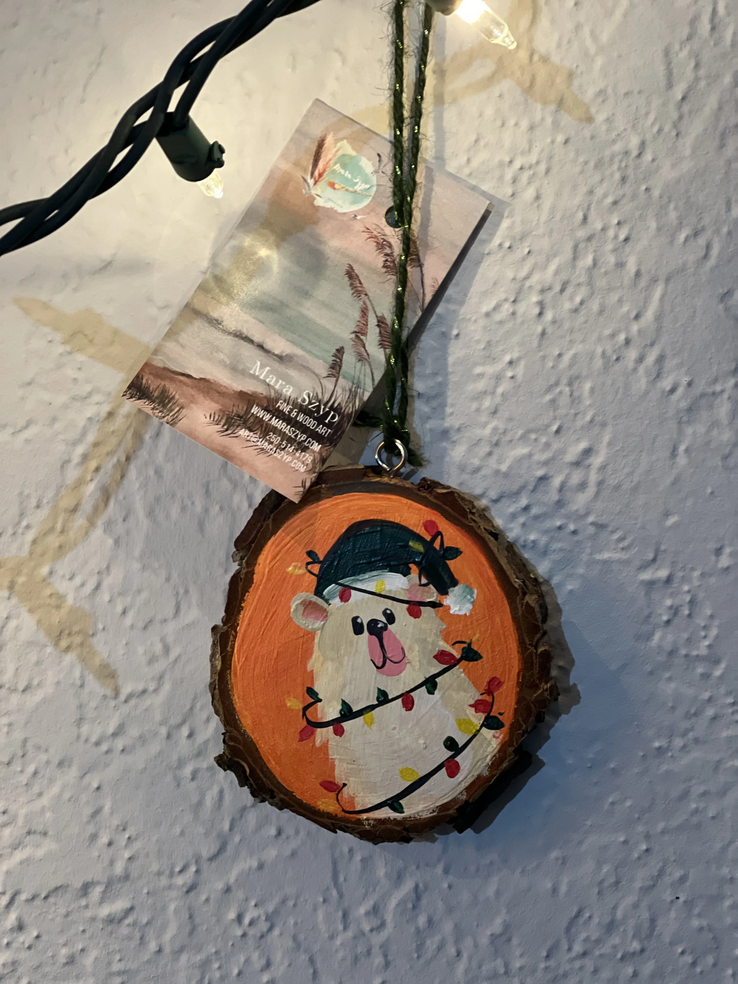 This is a one-of-a-kind piece. I use a slab of wood locally sourced from Vancouver Island, which is treated and cut right here on the island. Each piece is hand-made and hand-painted, then covered with clear resin to create a beautiful hanging ornament.