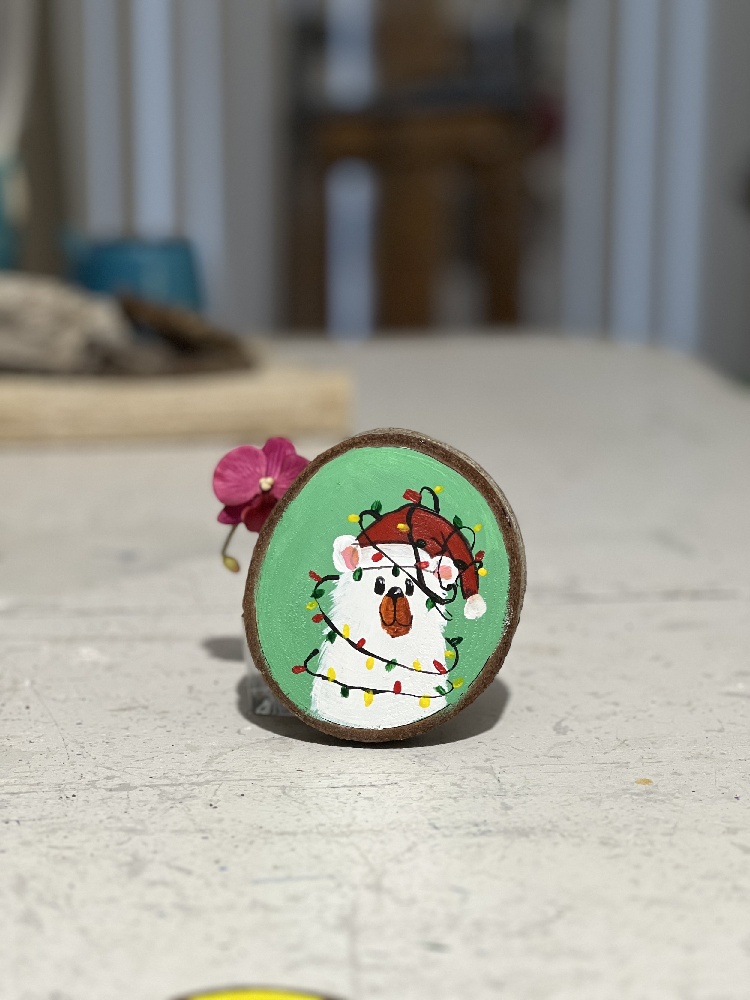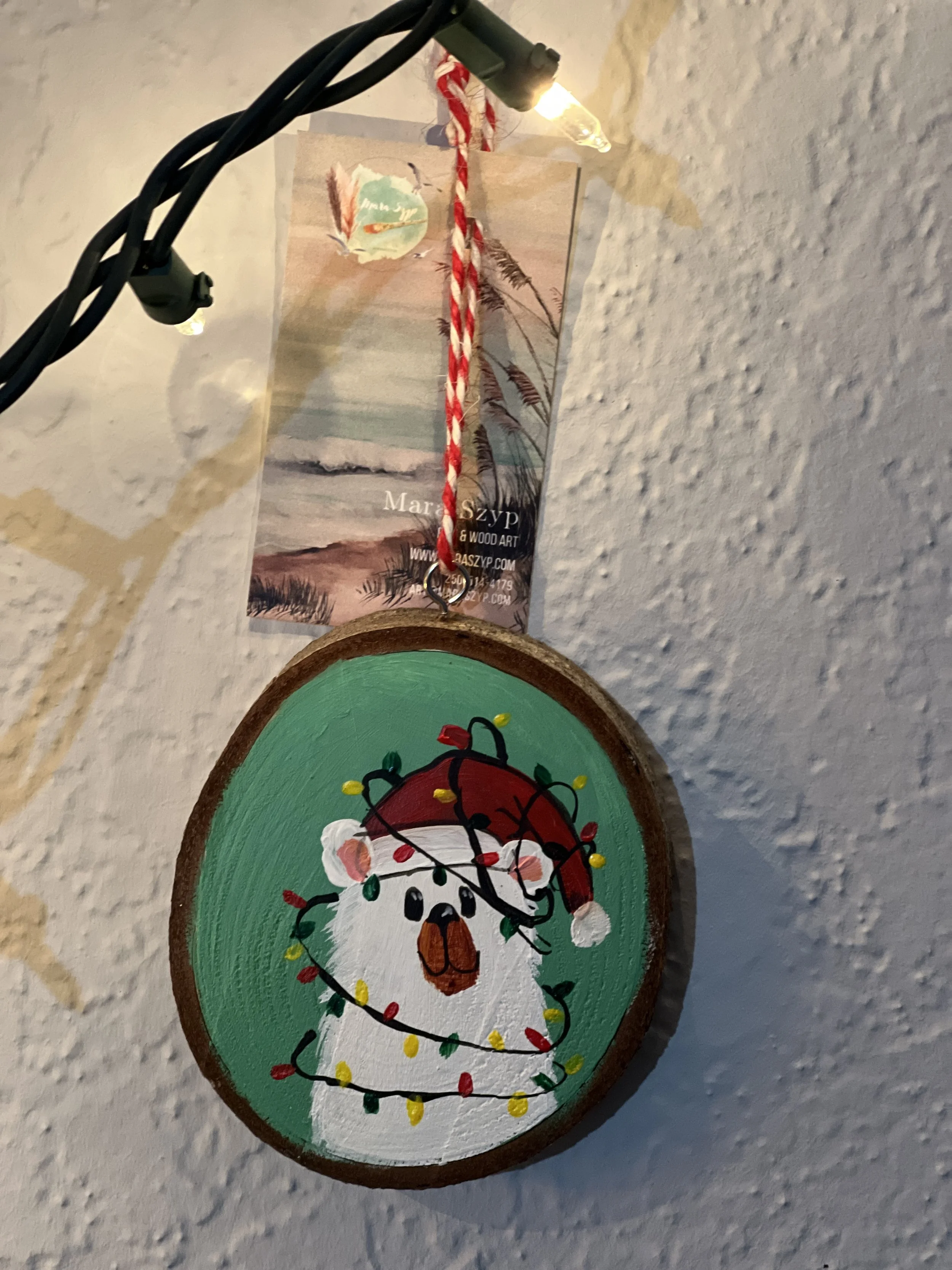 This is a one-of-a-kind piece. I use a slab of wood locally sourced from Vancouver Island, which is treated and cut right here on the island. Each piece is hand-made and hand-painted, then covered with clear resin to create a beautiful hanging ornament.