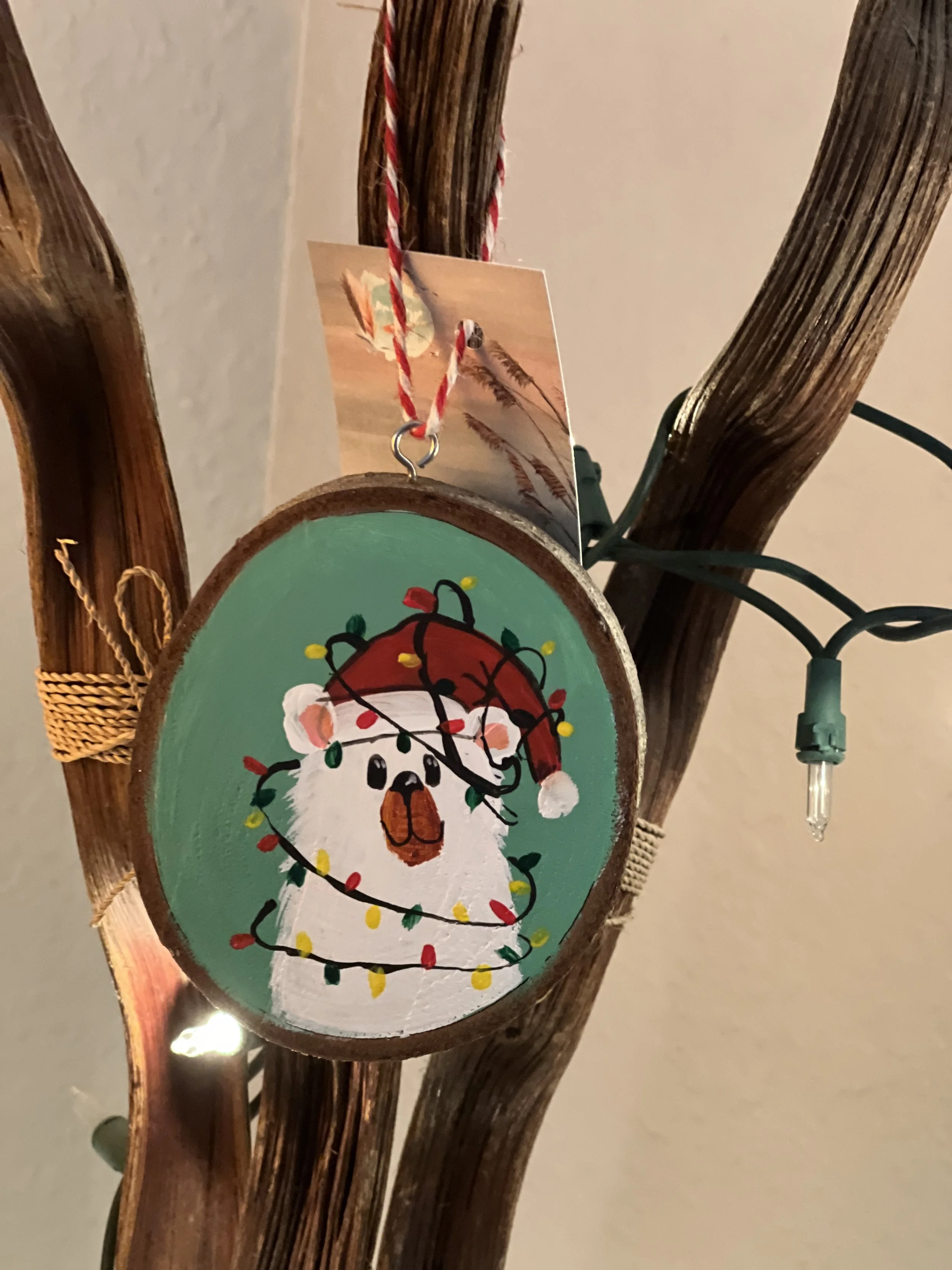 The size of the wood varies depending on the branch, typically between 4 and 5 inches. The natural imperfections in the wood add to its unique charm. Each ornament includes an eye hook and a rustic twine, showcasing a live edge.