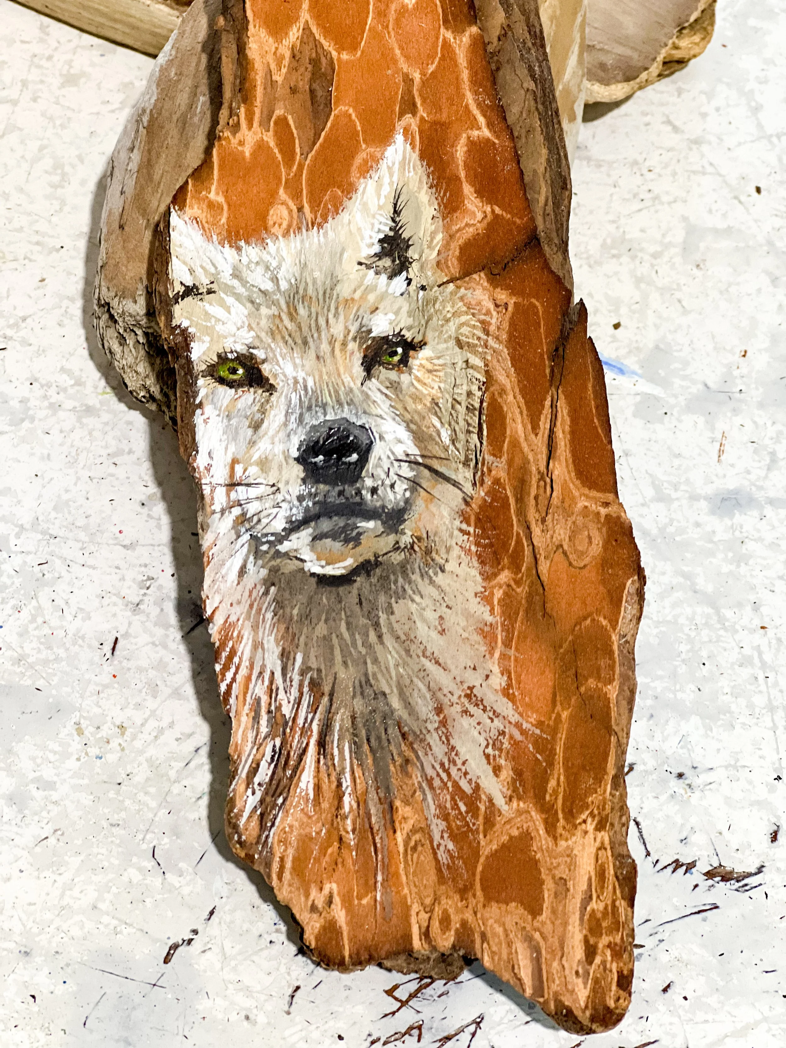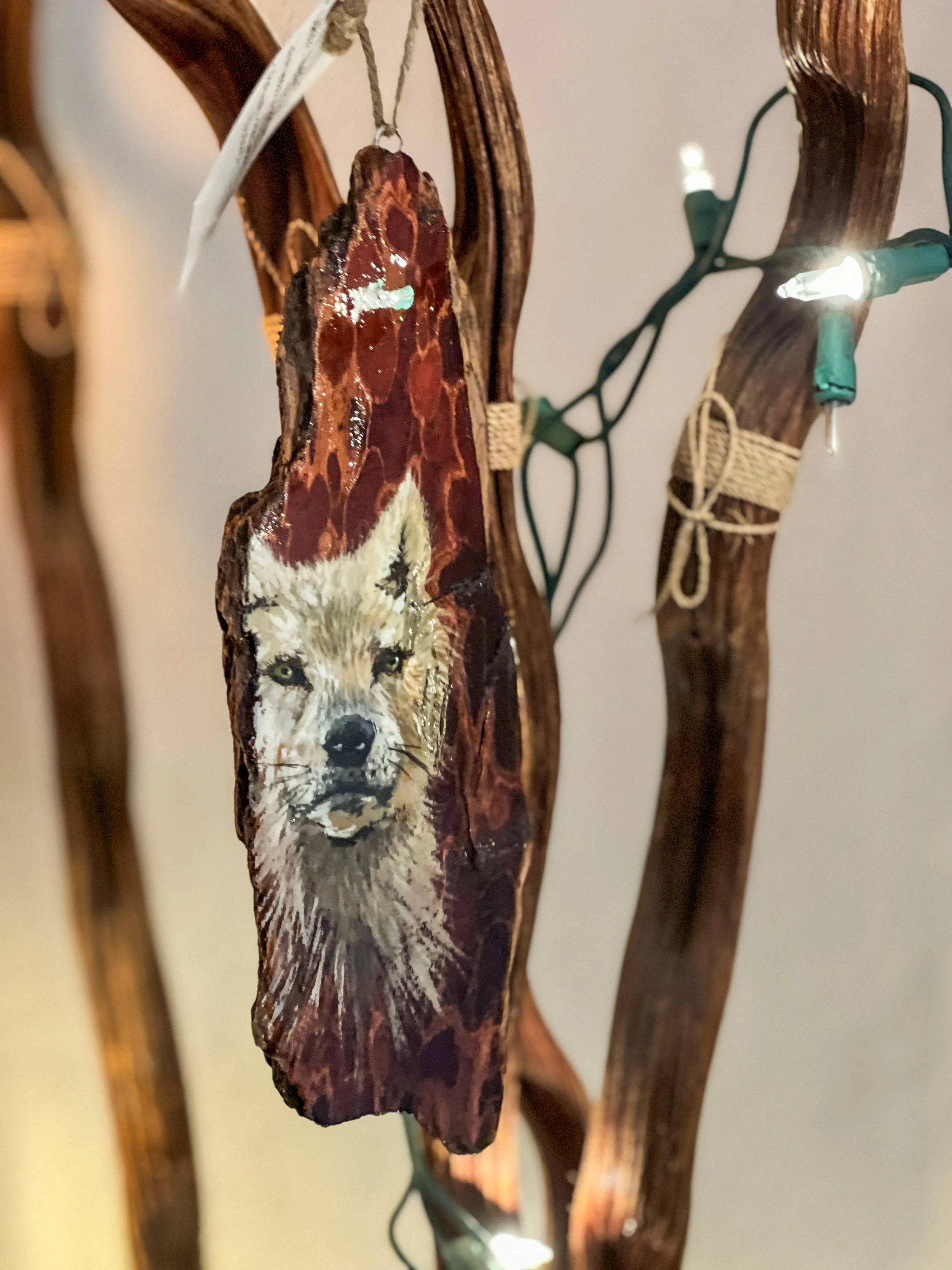 This one-of-a-kind, hand-painted artwork is created on a piece of locally sourced driftwood, collected during one of our family hikes along the coast. While I searched for the perfect piece of wood, Koda enjoyed the gentle touch of ocean waves on his paws—a moment of inspiration captured in this artwork.