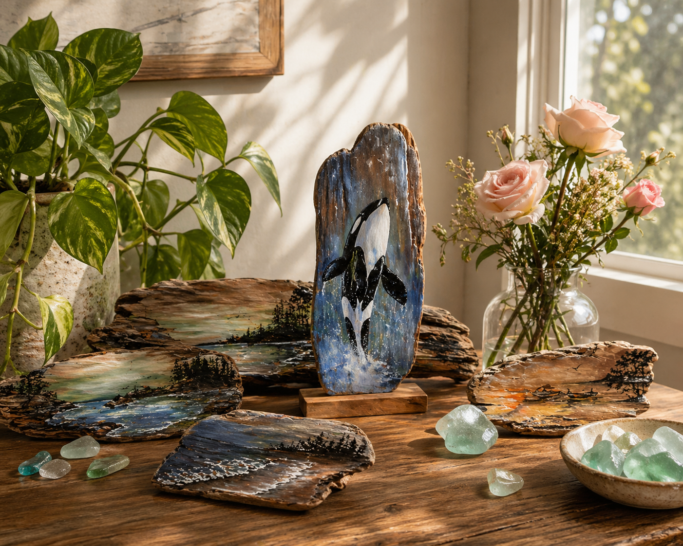One-of-a-kind driftwood artworks, hand-painted on naturally shaped wood. Coastal scenes and wildlife meet organic texture, elevated by handcrafted copper feet or refined wood bases, finished with resin, creating pieces that feel both grounded in nature and beautifully finished.