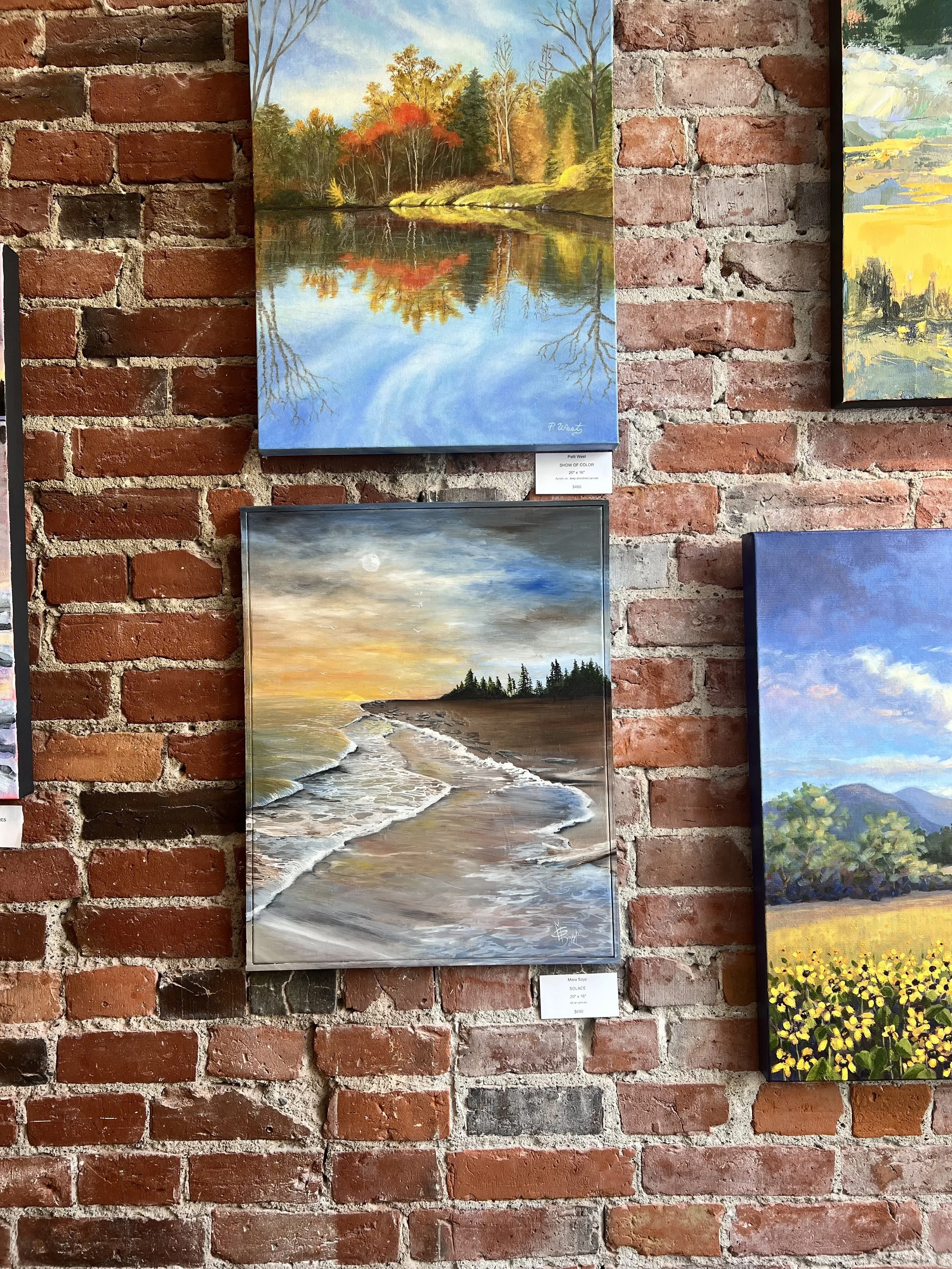 A limited selection of resin-finished driftwood and live edge wood artworks is available through the Sooke Arts Council Gallery. Canvas paintings are presented occasionally during select exhibitions.